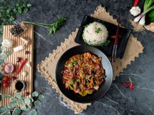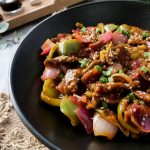 In a bowl,add beef,soy sauce,lemon juice,vinegar,ginger garlic paste,sriracha sauce,black pepper powder,salt and mix well.