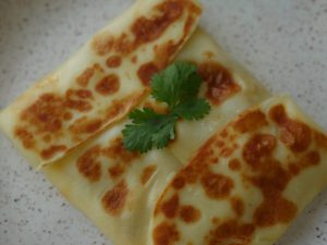 -Gently roll with the help of a rolling pin, pipe out prepared malai filling (1 & ½ tbs), sprinkle almonds & pistachios, now fold & seal the edges properly. (Makes: 8-9)