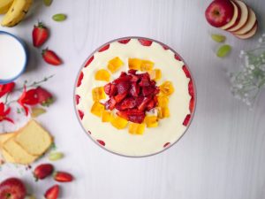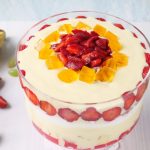 -In a trifle bowl,add red jelly cubes,plain cake cubes,sugar syrup,prepared custard,whipped cream, prepared mixed fruits,sugar coated strawberries & line the inner side of bowl with strawberry slices.