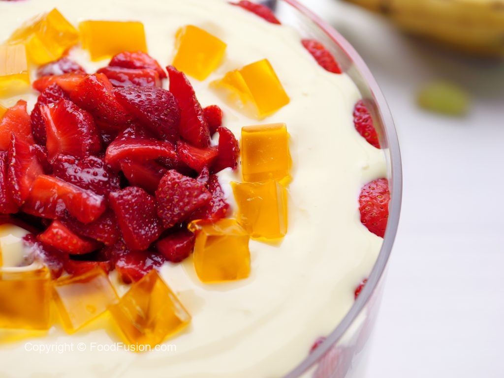 -Trifle bowl mein red jelly cubes,plain cake cubes,sugar syrup,tayyar custard,whipped cream,tayyar mixed fruits aur sugar coated strawberries dal ker bowl ki sides ker strawberry slices laga lein.