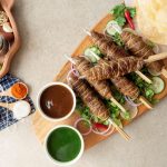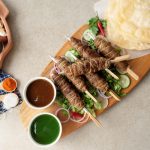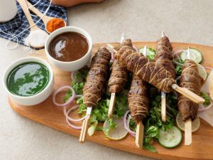 Wet hand with water,take a mixture (75g) and thread on wooden and metal skewers and tie with kitchen twine/thread (makes 10-12).