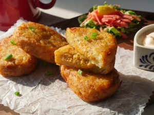 Grease hands with oil,take a potato mixture and flatten on your palm,add chicken mince mixture and cover the filling with chicken mixture to make hash brown of equal sizes  (makes 14-15) and freeze for 3-4 hours before frying.