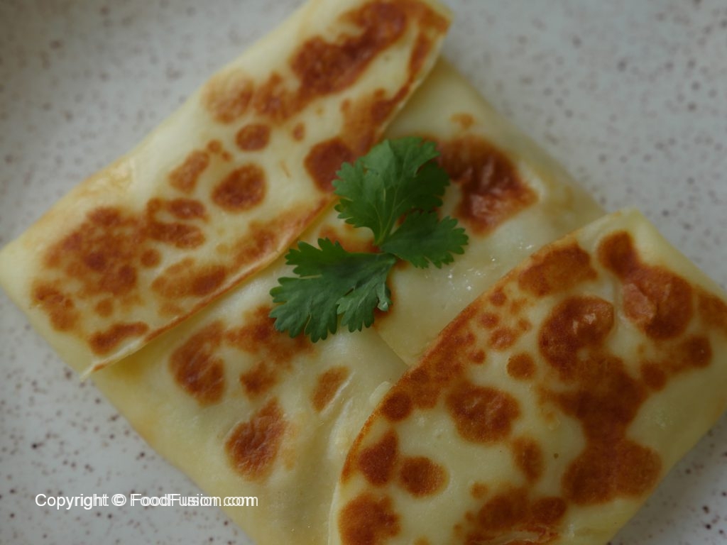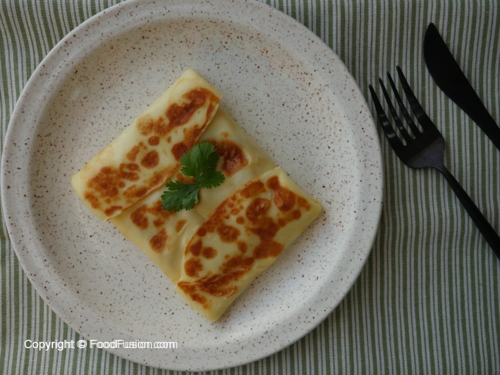 Turn off the flame,on prepared crepe,add cheese slice,chicken filling and fold all four sides carefully.
