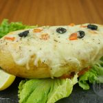 Fill potato with salt, butter, mince chicken, green onion, tomatoes. Add cheese on top, garnish with olives, black pepper and bake for 20 minutes.