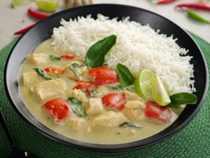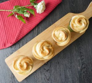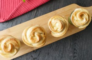 Add chicken stuffing and starting from one end,roll carefully to form a rose shape (makes 6-8).