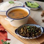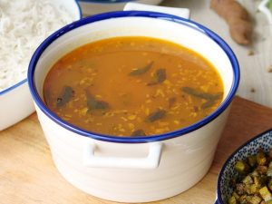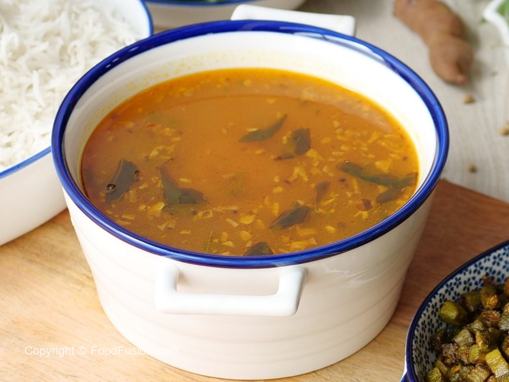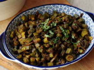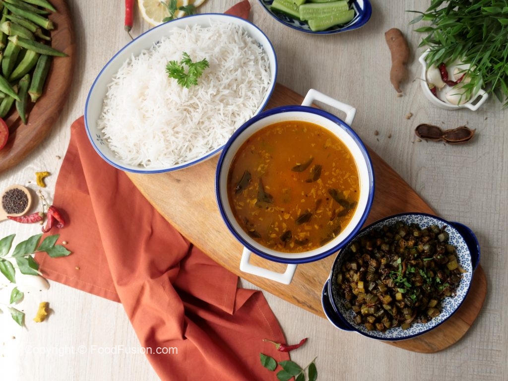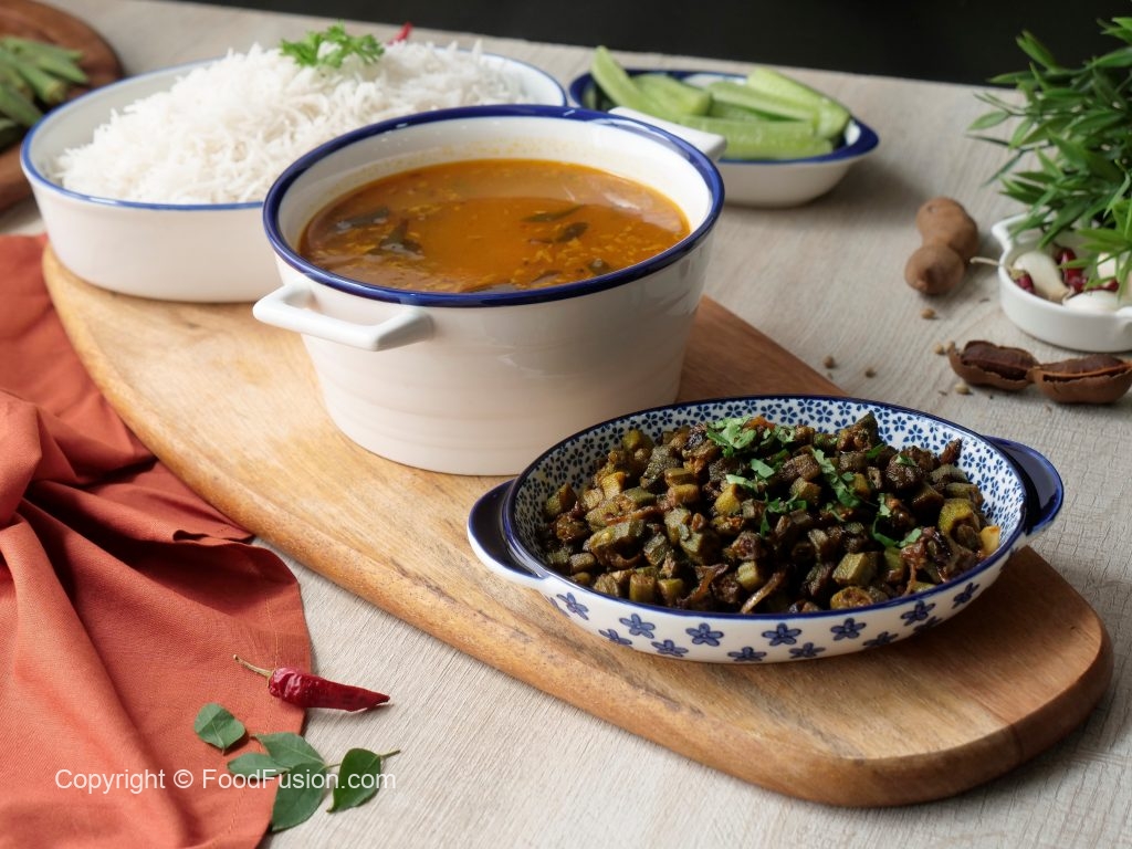 Serve tamatar ka khatta with bhindi ki sabzi & boiled rice.