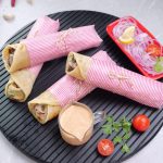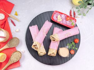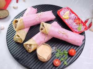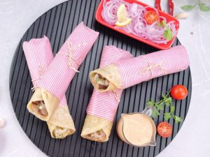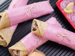 -Paratha per mayo sauce,cooked beef cubes,pyaz rings,hari chutney aur mayo sauce dal ker butter paper mein warp ker ka serve karein (makes 4-5).