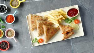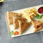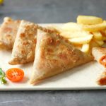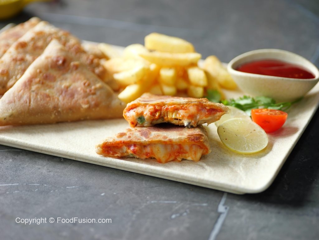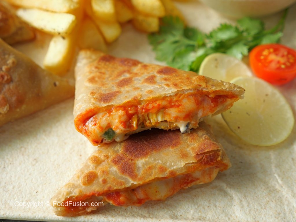 -Add & spread pizza sauce,mix cheese,cooked chicken,onion,capsicum,black olive,prepared mayo sauce & fold into a triangle shape & apply water to seal the edges.