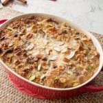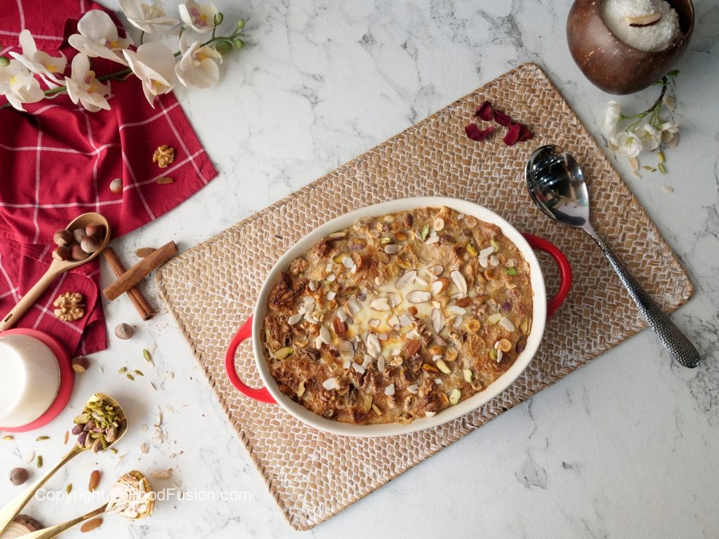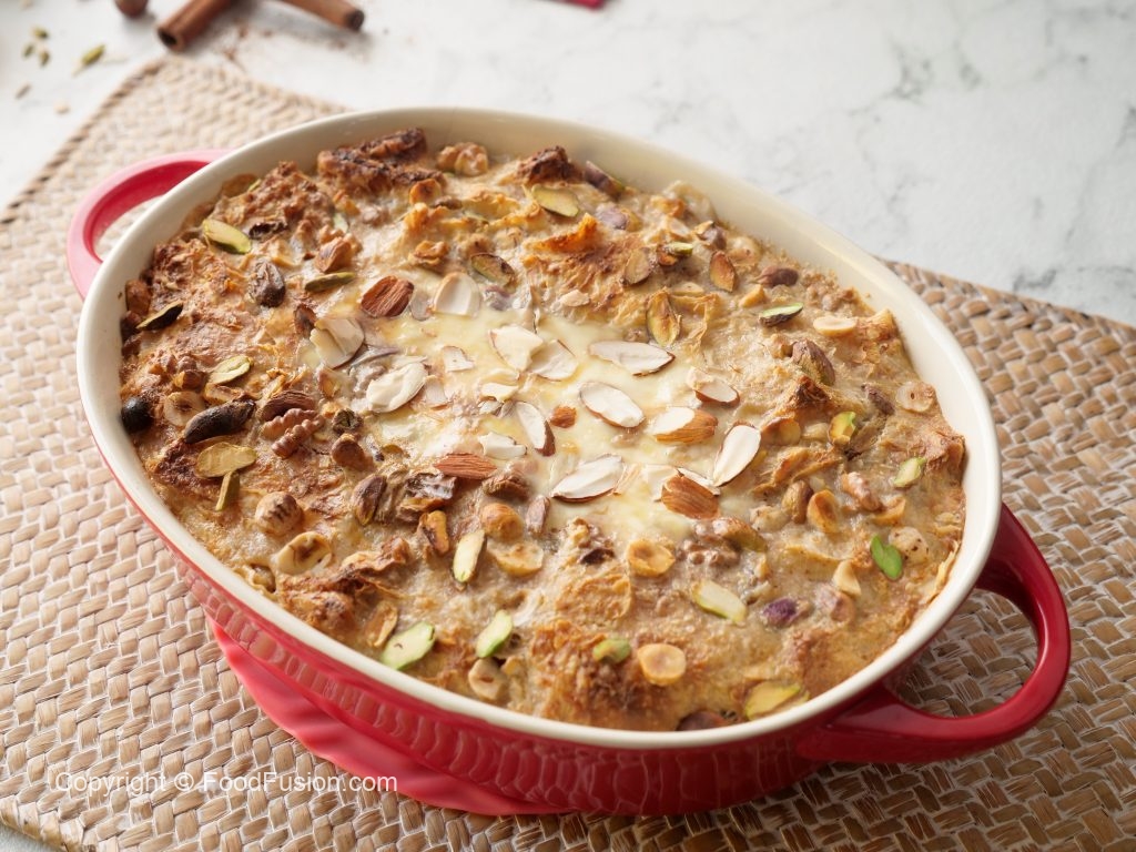 Baking dish mein puff pastry ko break ker ka dal dein,darchini powder,khopra,kishmish, hazelnuts, akhrot,pista,tayyar doodh dal dein aur upper sa cream aur badam dal dein.