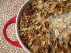 On baking dish,break puff pastry into pieces,sprinkle cinnamon powder,desiccated coconut,raisins, hazelnuts,walnuts,pistachios,prepared milk,topped with cream and sprinkle almonds.