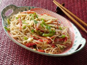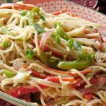 Boiled spaghetti,safed mirch powder,kali mirch crushed,nama,chicen powder,soy sauce,hot sauce aur sirka dal ker 1-2 minutes kliya ache tarhan mix ker lein.