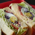On cling film,place bread slices,spread cream cheese,ice berg,tomato slices,cucumber,egg & chicken mixture,purple cabbage mixture,boiled egg,carrot mixture and top with another slice,wrap in cling film then cut into two pieces & serve!