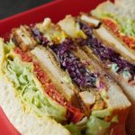 On cling film,place bread slices and apply mayo mustard spread,ice berg,cheese slice,carrots mixture, fried chicken pieces,Bbq sauce,cucumber slices,purple cabbage mixture,tomato slices,fried egg and top with another slice,wrap in cling film then cut into two pieces & serve!