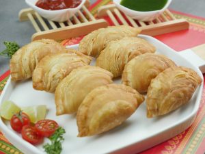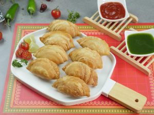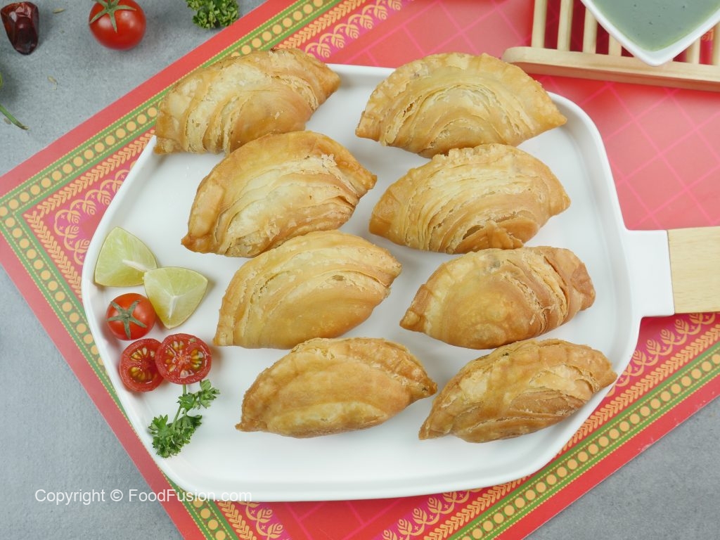 Dough ko samosa maker mein rakh ker tayyar chicken filling ko center mein dal dein,edges per pani laga lein aur samosa maker ko bund ker dein aur excess dough ko nikal lein (makes 24-25).